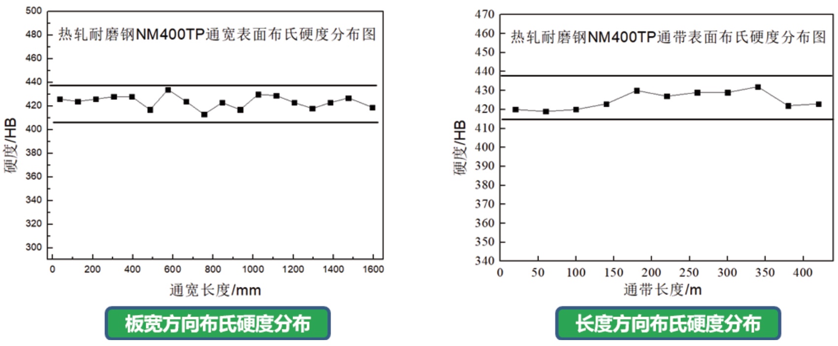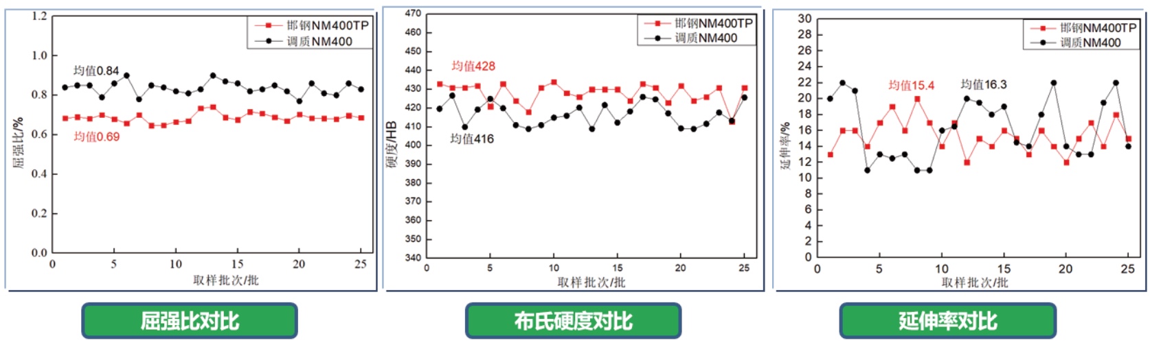 NM400TP性能分布情況(45個批次):布氏硬度高度均勻,波動<±15HBW,均勻磨損,保證使用壽命。抗拉強(qiáng)度≥1400MPa,延伸率>11%,保證馬氏體超高強(qiáng)耐磨鋼的加工、成型性能。